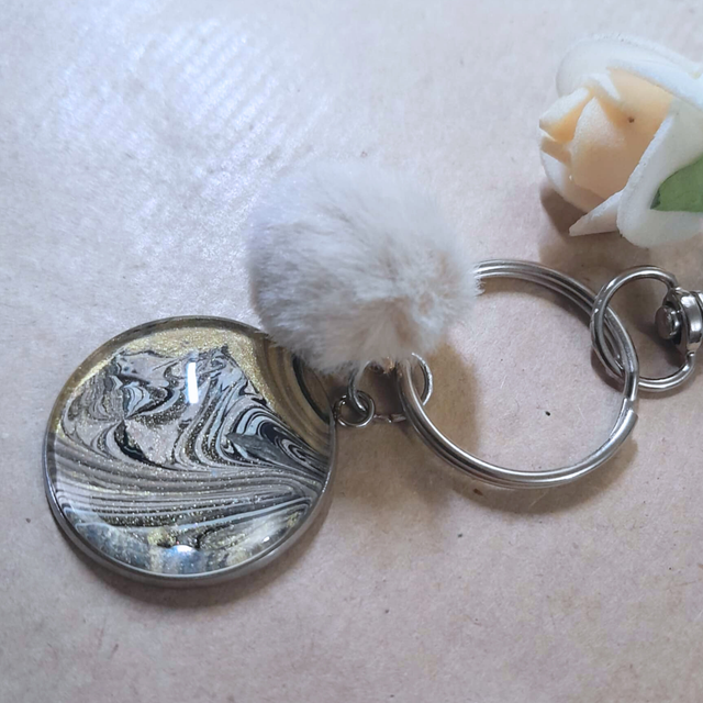 3. Matière : Support en métal argenté, pompon beige.