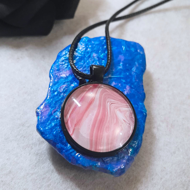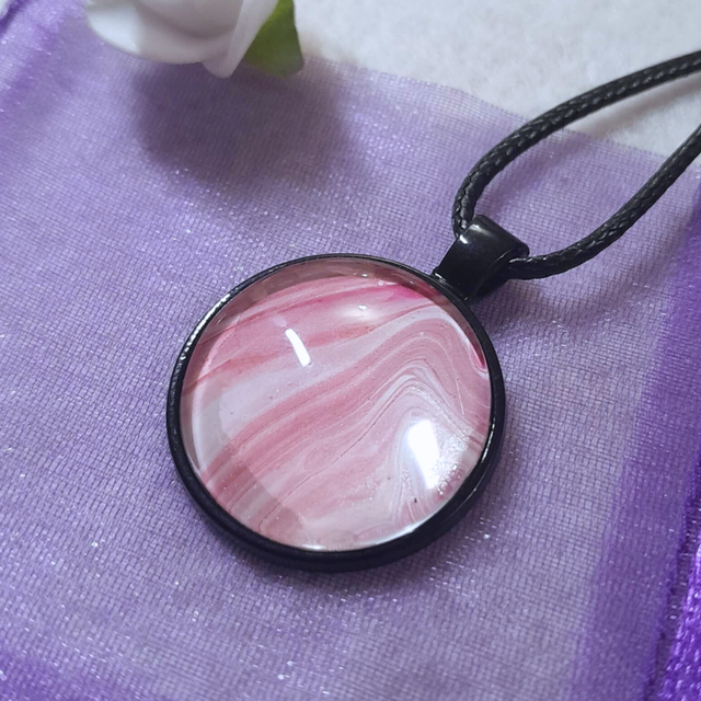 Un collier-pendentif tout en nuances, célébrant la féminité avec un dégradé de roses capturé dans un écrin sombre.