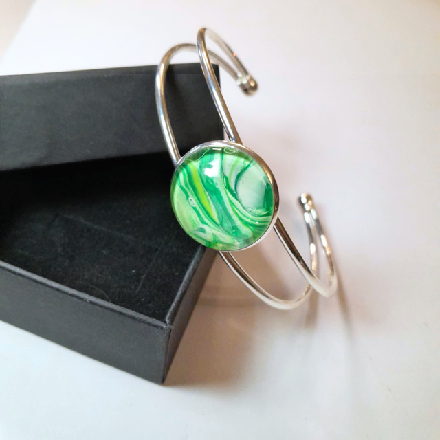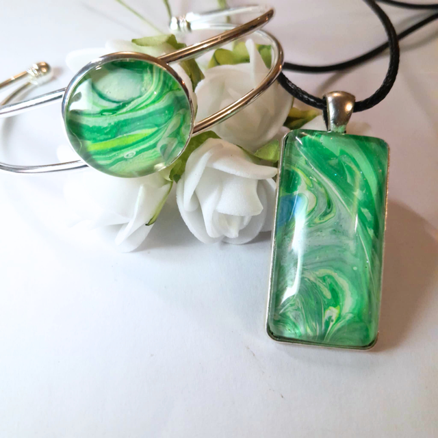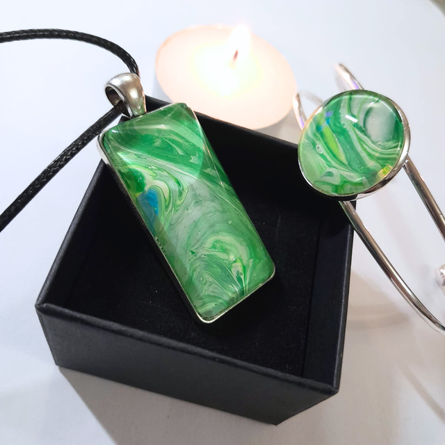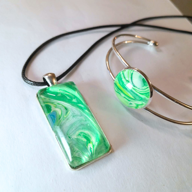 - Dimensions : Pendentif rectangulaire (4 x 2 cm), cabochon bracelet rond (20 mm).