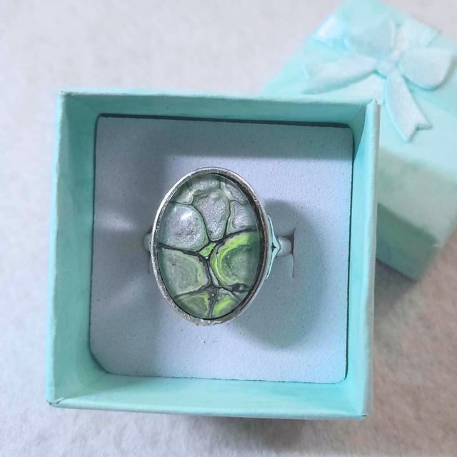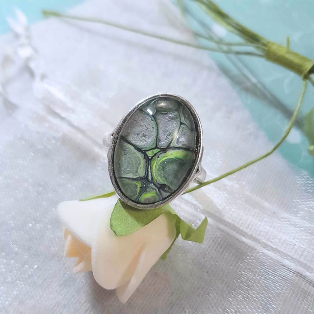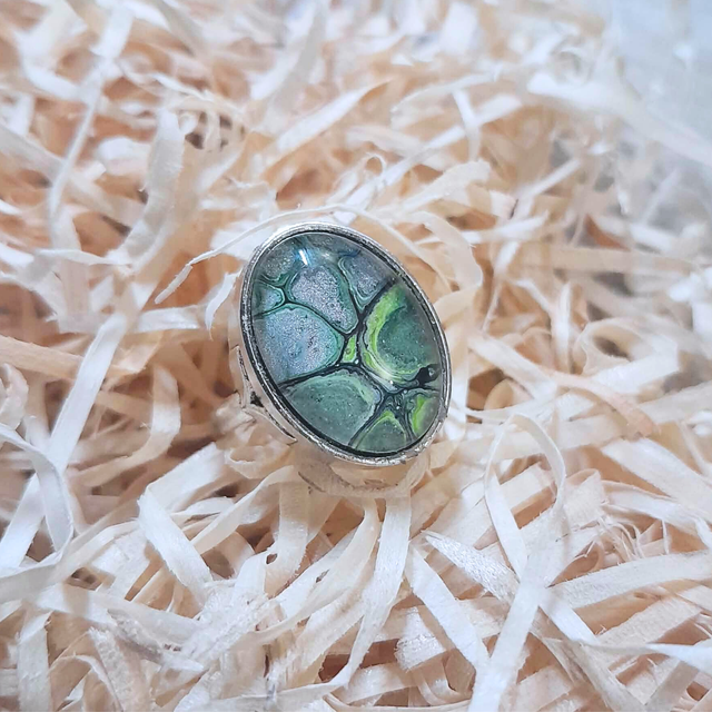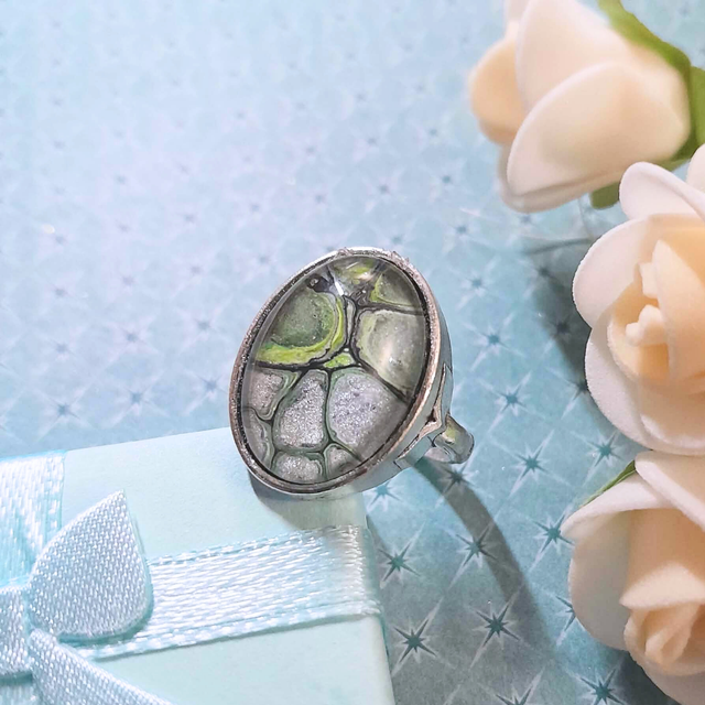 Ce bijou se distingue par son élégant format ovale et son motif aux nuances de vert et de noir rehaussées d'éclats argentés, protégé sous un dôme de verre.