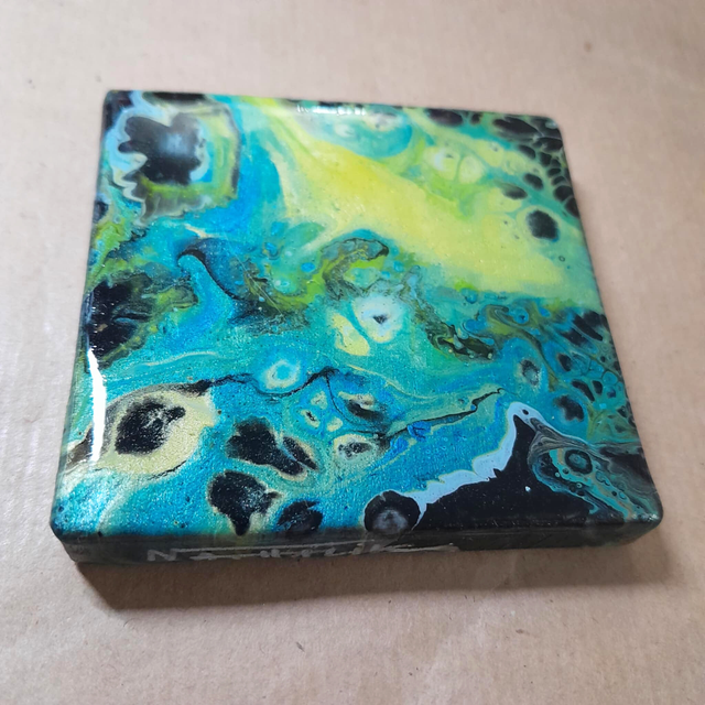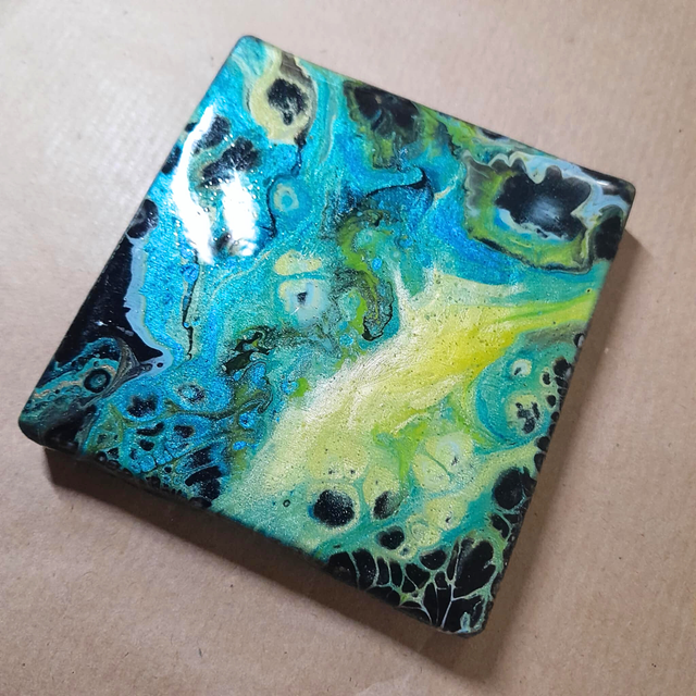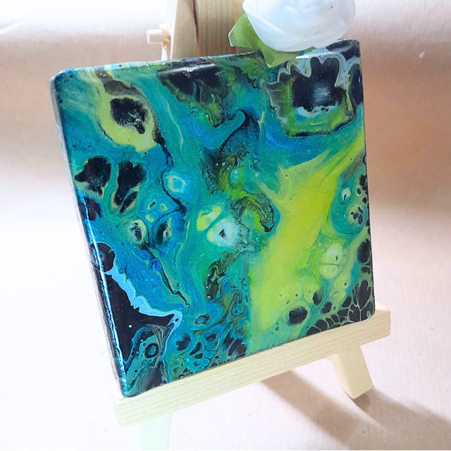 - Matière : Peinture acrylique fluide sur support, protection en résine UV et chevalet en bois.