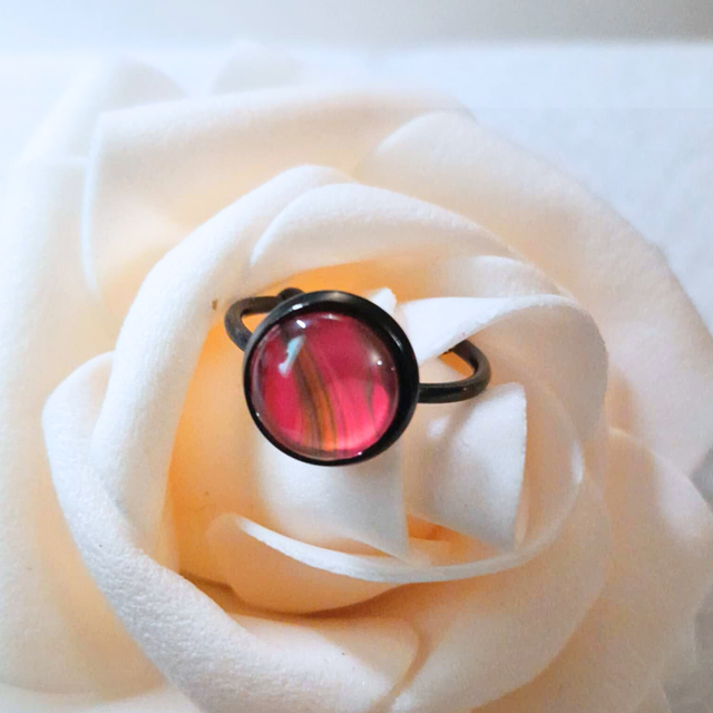 Une bague ajustable au style affirmé, mariant l'intensité du fuchsia et la chaleur du cuivre pour un look moderne et audacieux.