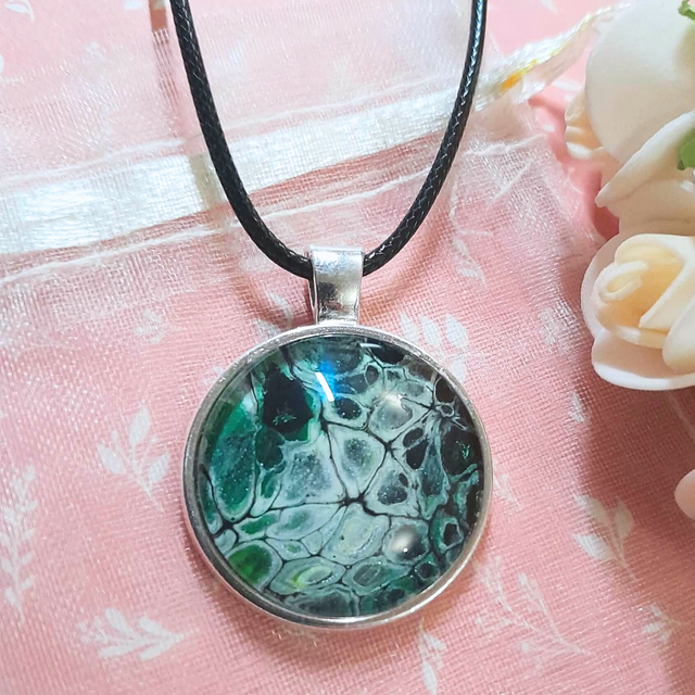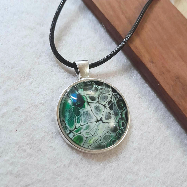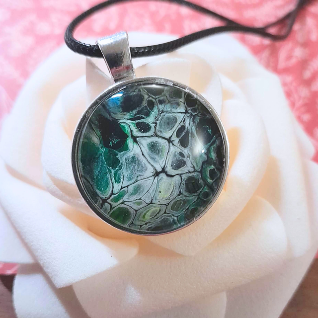 Ce bijou propose un motif organique aux teintes naturelles, mis en valeur par la transparence et la brillance du verre.