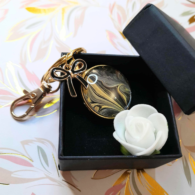 - Matière : Support en métal doré, cabochon en verre de 25 mm et breloque ruban noir.