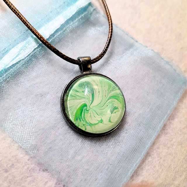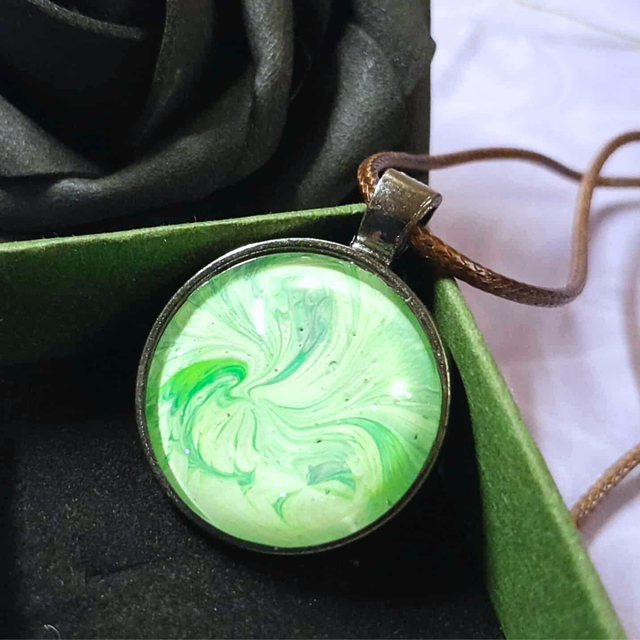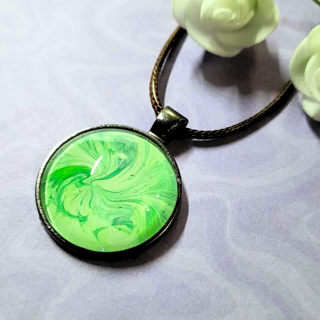Un pendentif empreint de sérénité, mariant la douceur du vert tendre à l'authenticité du bronze pour une élégance naturelle.