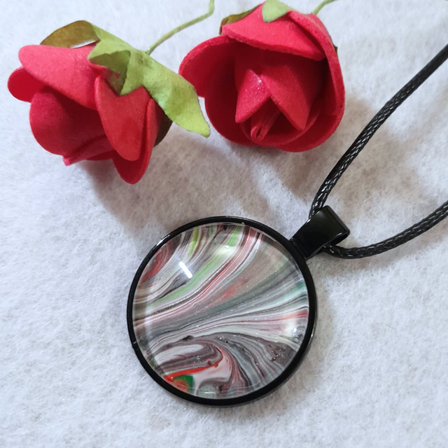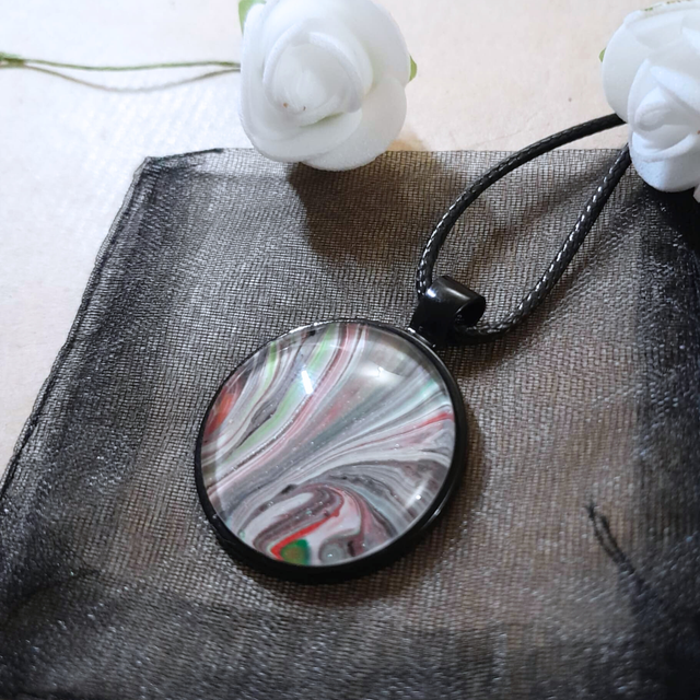 2. Matière : Support en métal noir, cabochon en verre de 25 mm et cordon en cuir PU.