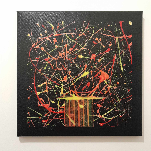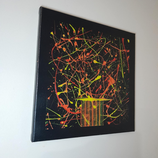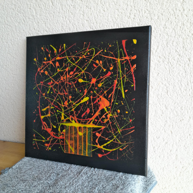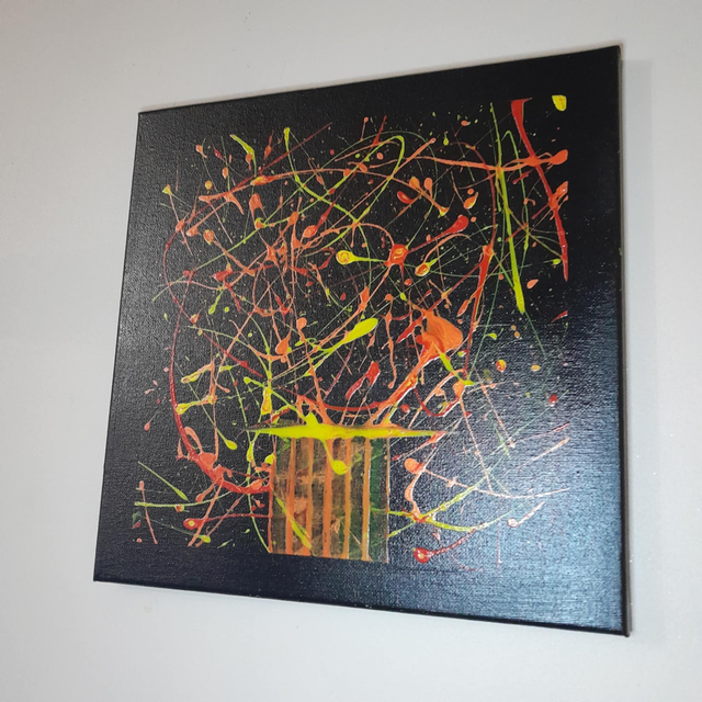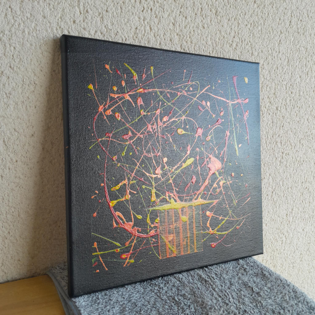 Découvrez "Le chant des éclats", une œuvre abstraite où l'énergie jaillit d'un fond noir profond. Des projections vibrantes de rouge, de jaune et d'orange créent un spectacle visuel dynamique, comme un chant coloré et puissant. Ce tableau évoque une explosion de vie et de créativité.