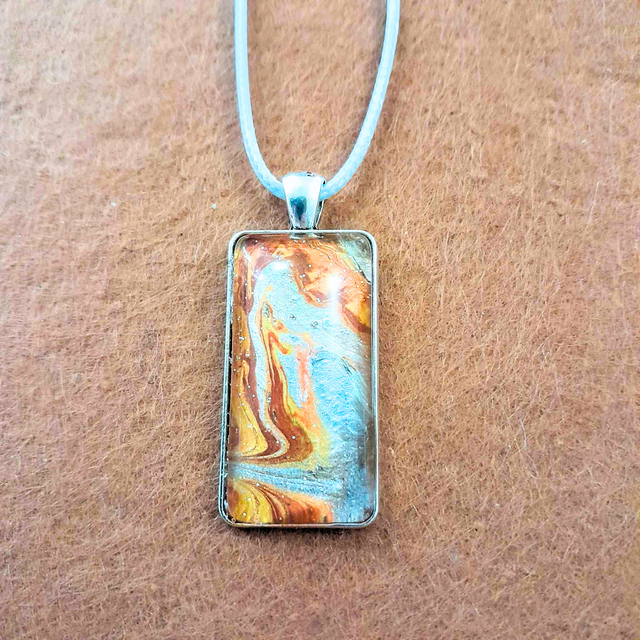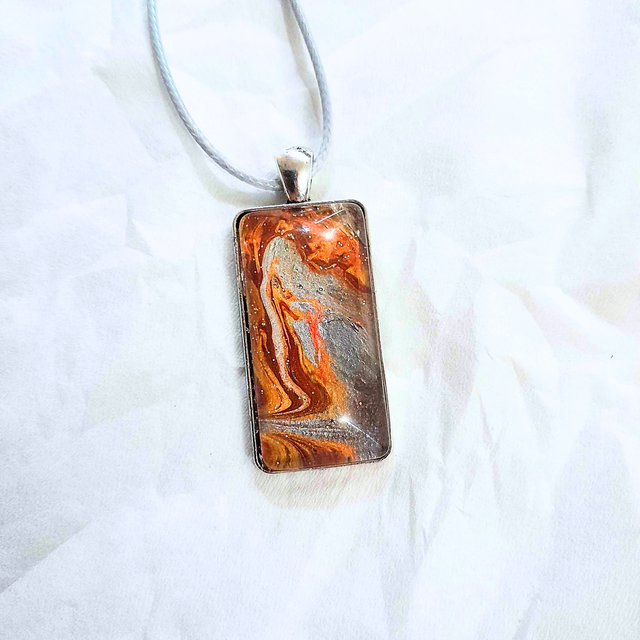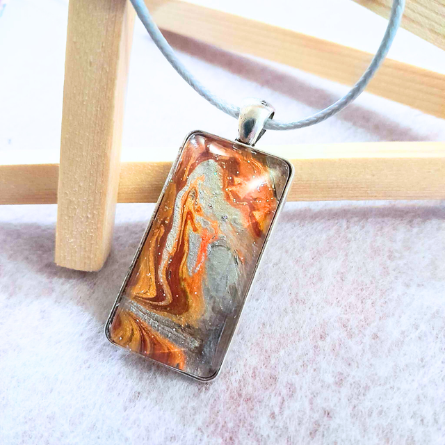 - Matière : Support en métal argenté, cabochon en verre rectangulaire de 20x40 mm et cordon gris ajustable.