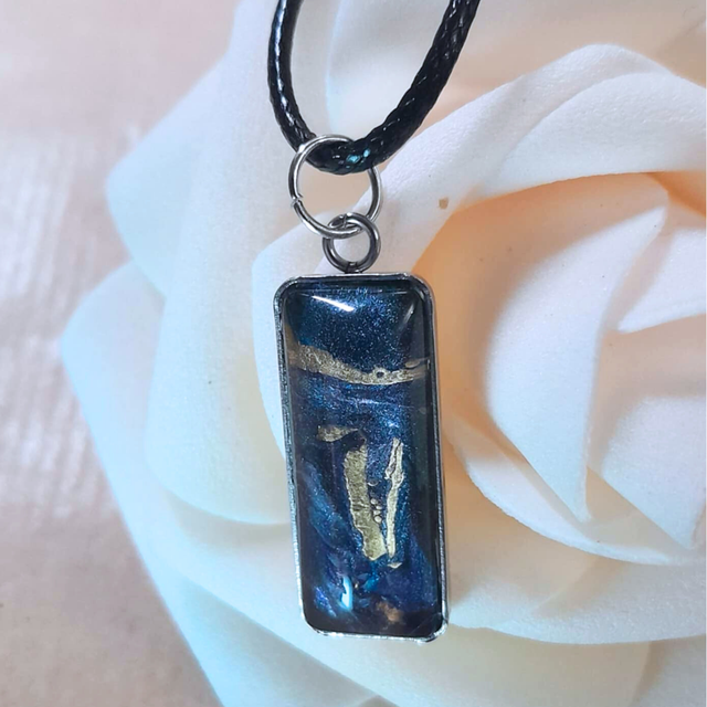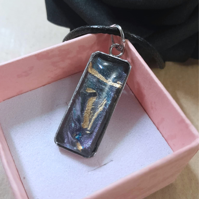 - Matière : Support en métal argenté, cabochon en verre rectangulaire de 10x25 mm et cordon noir.