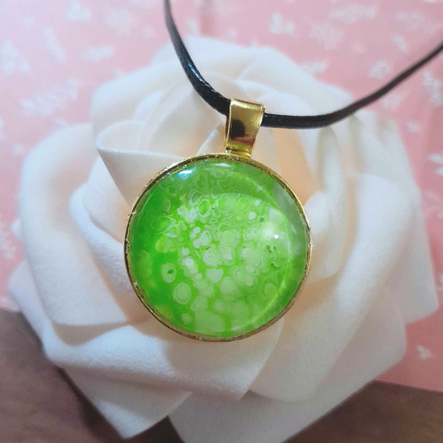 Ce bijou présente un motif aux teintes végétales et claires, protégé sous un dôme de verre qui apporte profondeur et éclat.