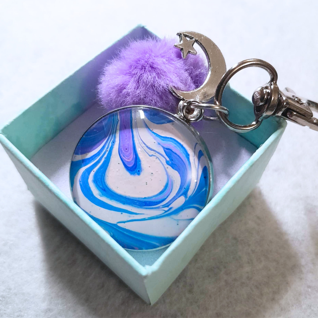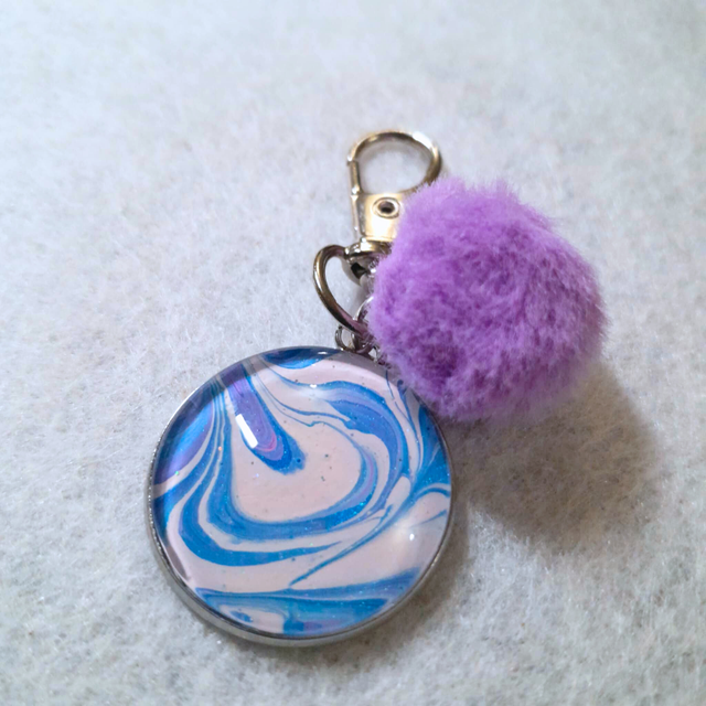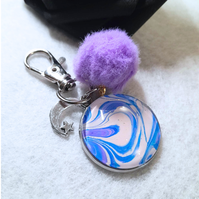 - Matière : Cabochon en verre de 25 mm, pompon doux violet et breloque lune.