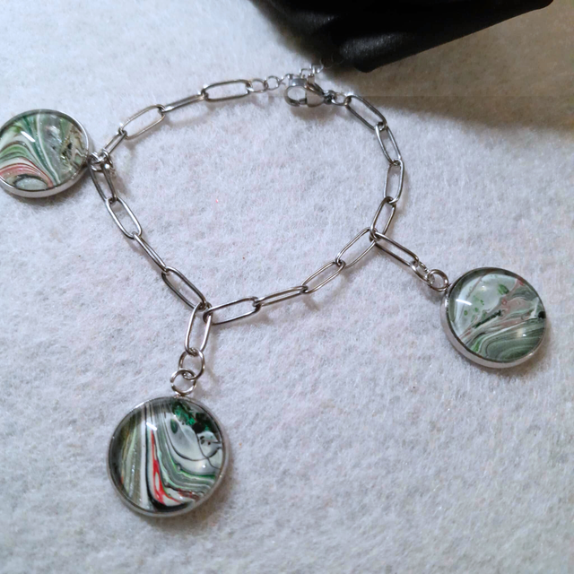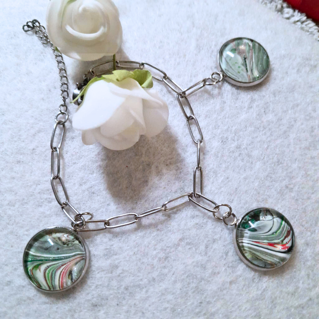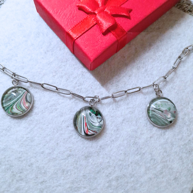 - Matériaux : Support et chaîne en métal argenté, trois cabochons en verre de 16 mm.