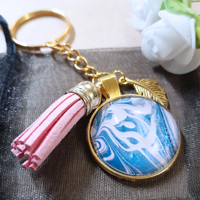 2. Matériaux : Support en métal doré, cabochon en verre de 25 mm, breloque plume et pampille rose.