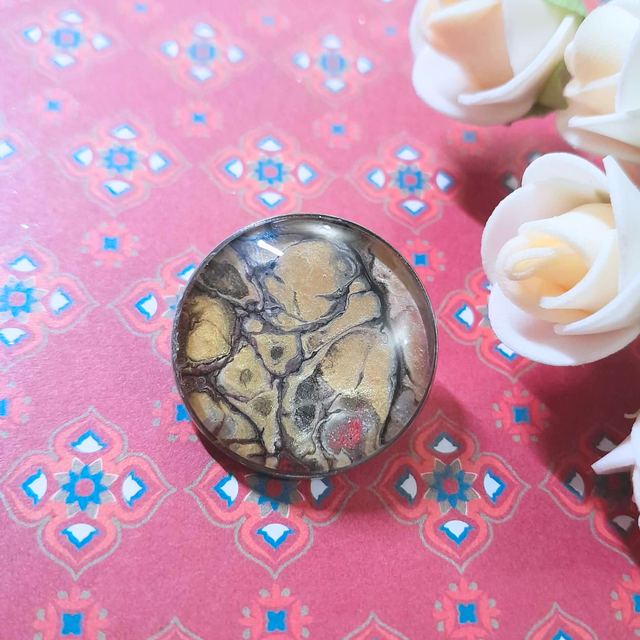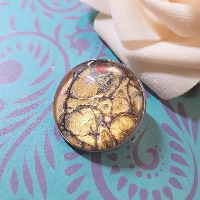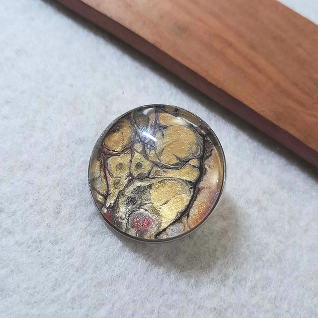 Cette broche présente un motif aux contrastes raffinés, protégé sous un dôme de verre qui sublime l'intensité des couleurs et apporte un bel effet de profondeur.