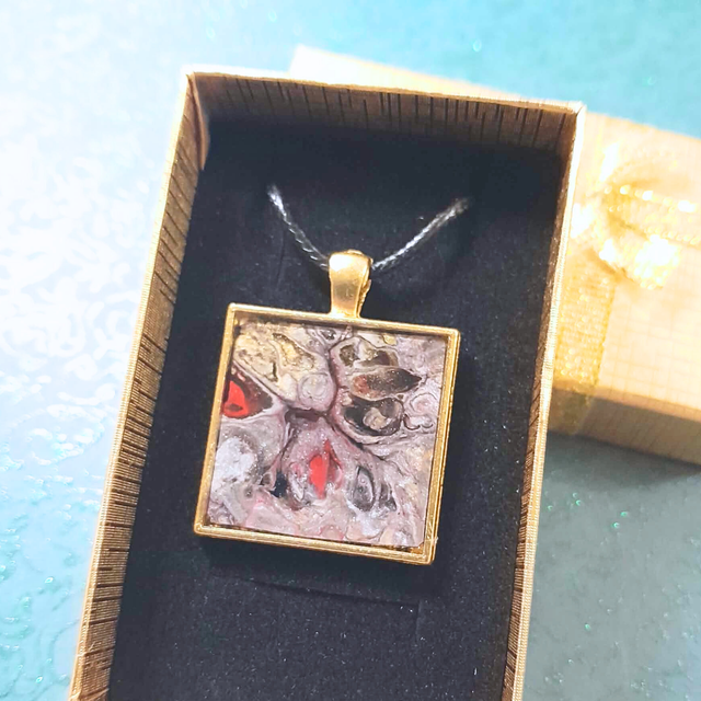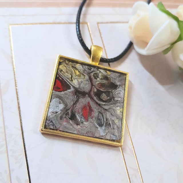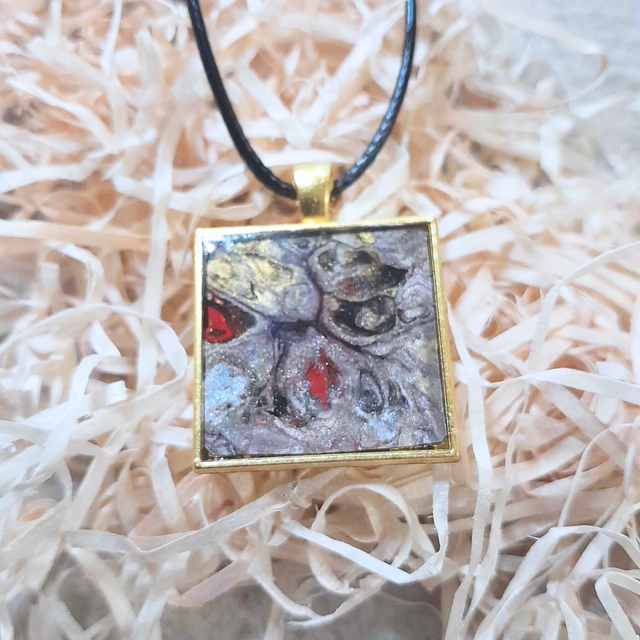 Ce bijou se distingue par son format carré graphique et son motif précieux aux nuances d'or, de noir et de rouge, protégé par une finition en résine UV.