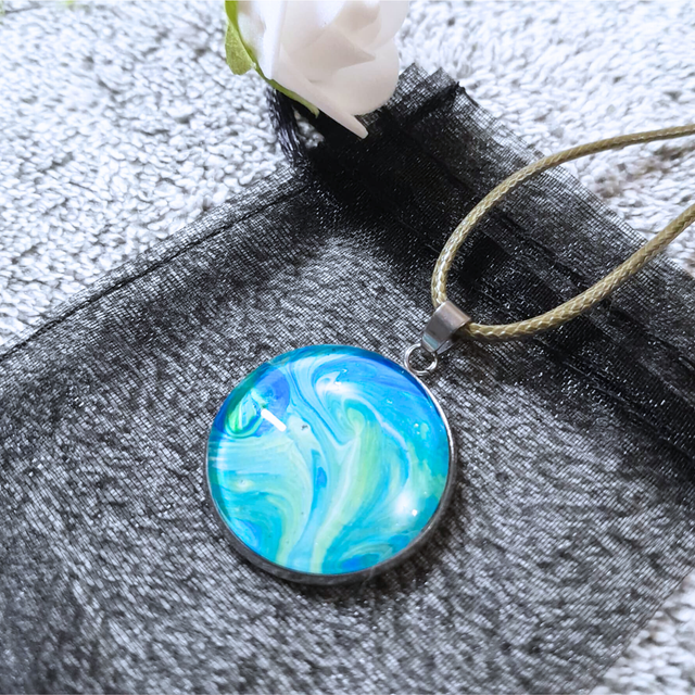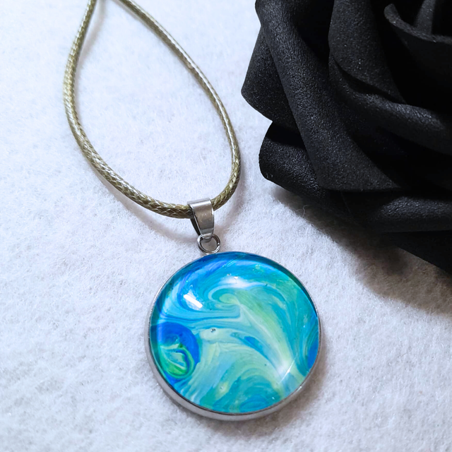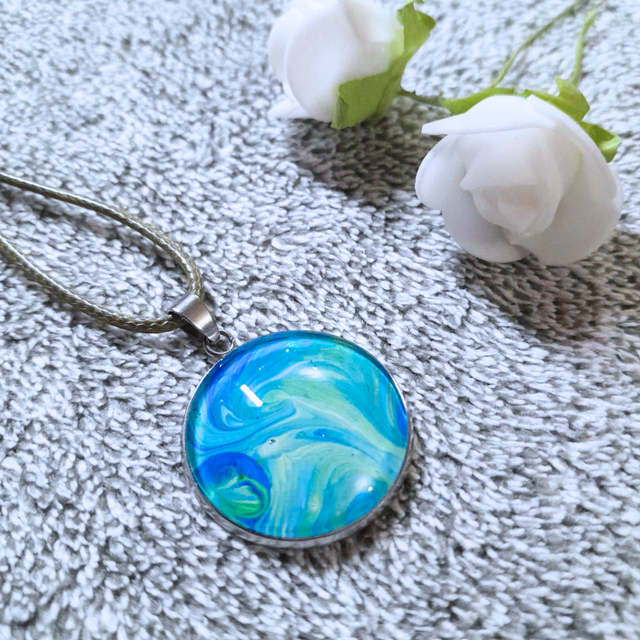 - Matériaux : Support en métal argenté, cabochon en verre de 25 mm et cordon kaki ajustable.