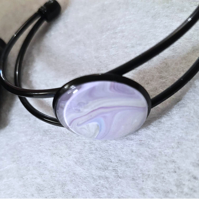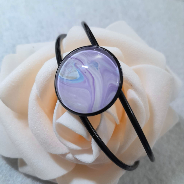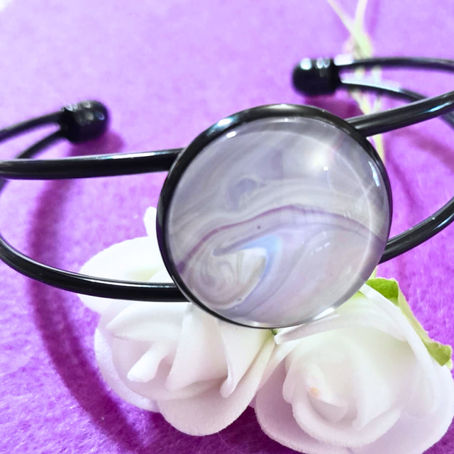 4. Le petit plus : Le contraste saisissant entre la force du support en métal noir et la grande douceur des teintes pastelles du cabochon.