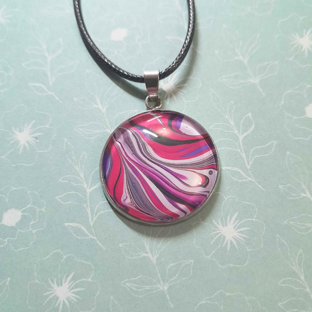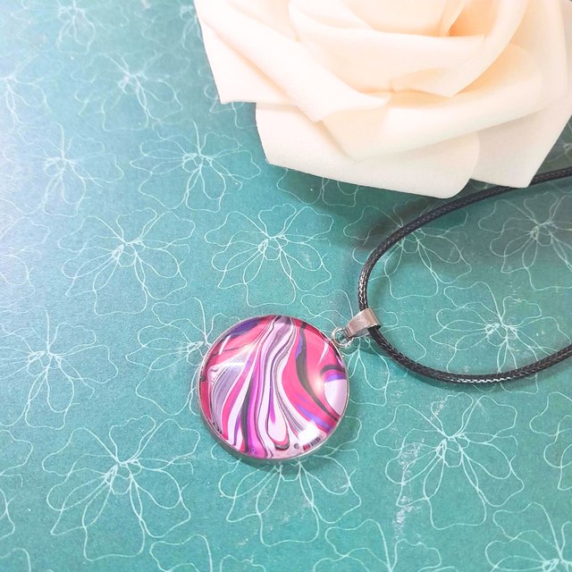 - Matériaux : Support en métal argenté, cabochon en verre de 25 mm et chaîne en cuir PU noir ajustable.