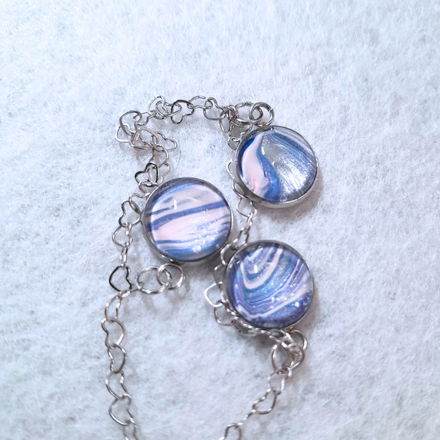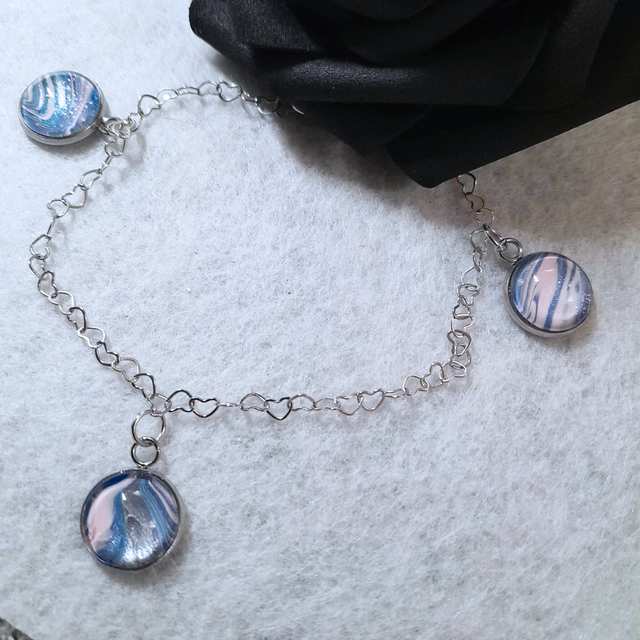 - Matériaux : Chaîne en métal argenté à maille cœurs et trois cabochons en verre de 12 mm.