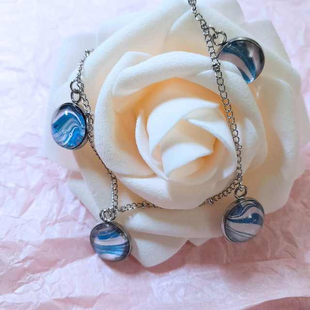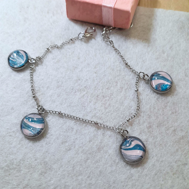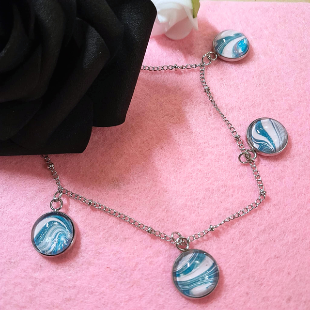 - Matériaux : Chaîne en métal argenté et quatre cabochons en verre de 12 mm.