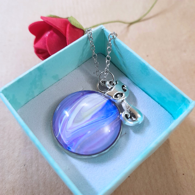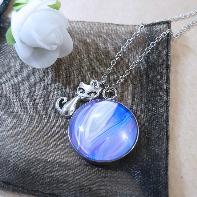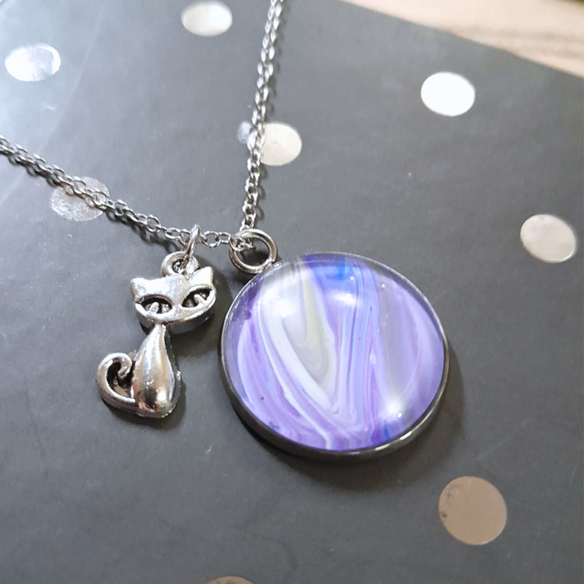 - Matériaux : Chaîne et support en métal argenté, cabochon en verre de 20 mm et breloque chat.