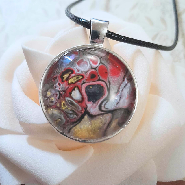 Ce bijou présente un motif contrasté et chaleureux, mis en valeur par la clarté du métal argenté et la profondeur du verre.
