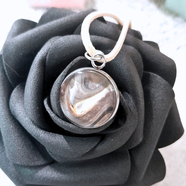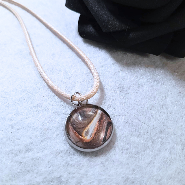 2. Matériaux : Cabochon rond en verre (14 mm), support en métal argenté et cordon beige ajustable.