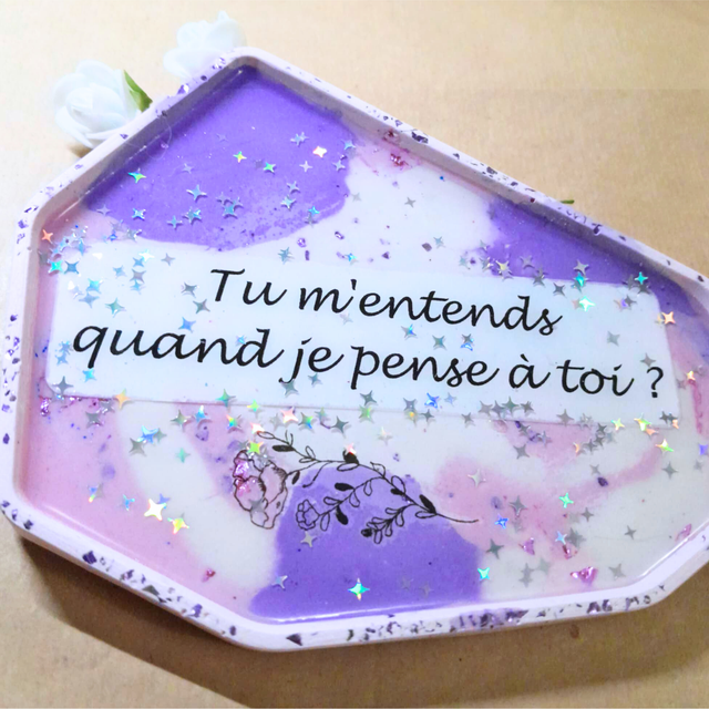 - Matériaux : Éco-résine, étoiles scintillantes et résine UV.