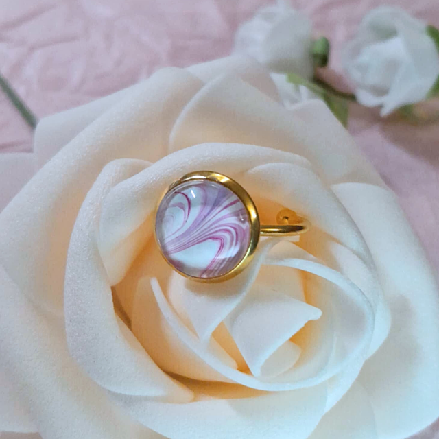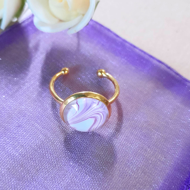 2. Matériaux : Cabochon en verre (12 mm) et anneau ajustable en métal doré.