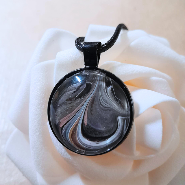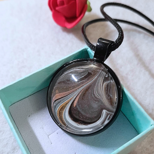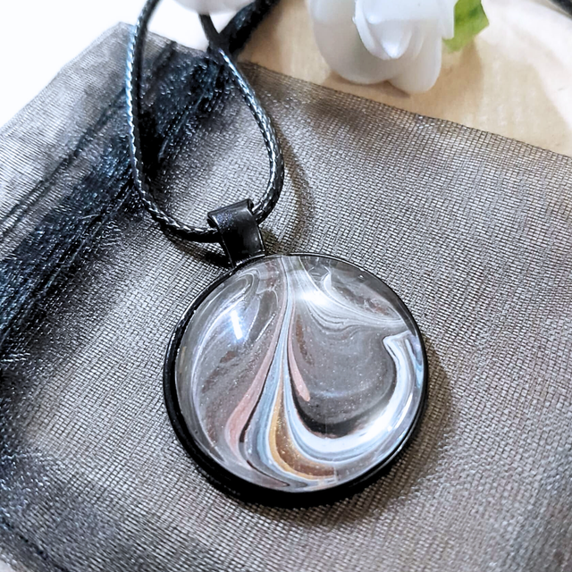 2. Matériaux : Cabochon en verre (25 mm), support en métal noir et cordon noir ajustable en cuir PU.