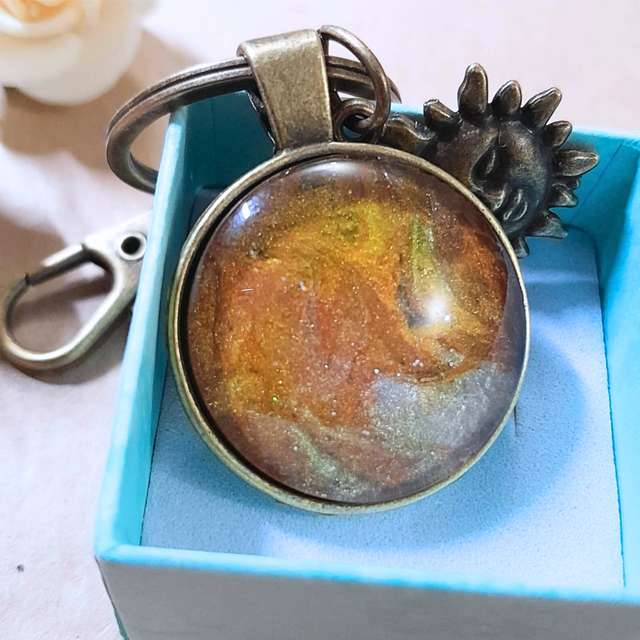 5. Le petit plus : L'utilisation du métal bronze ancien qui renforce l'aspect brut du motif. La breloque soleil apporte un relief supplémentaire à l'ensemble, faisant de cet accessoire un détail visuel fort pour personnaliser tes sacs ou tes clés.