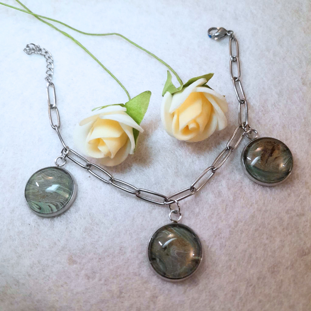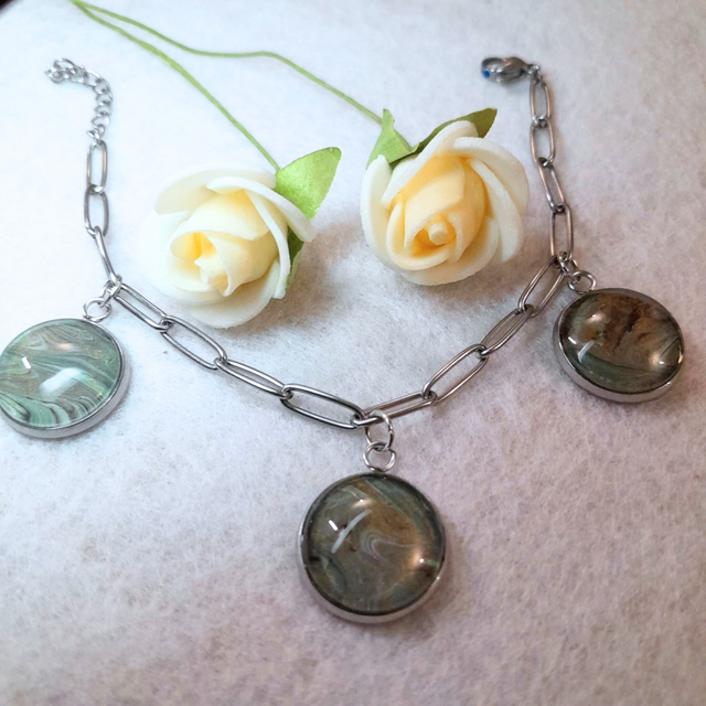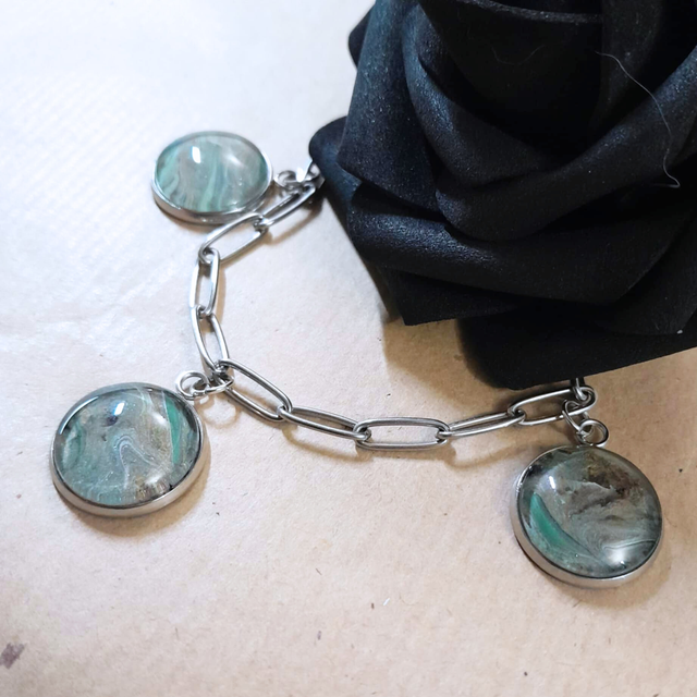 Ce bracelet se compose d'une série de trois cabochons circulaires montés sur une chaîne métallique fine, offrant un rendu visuel équilibré et naturel.