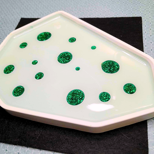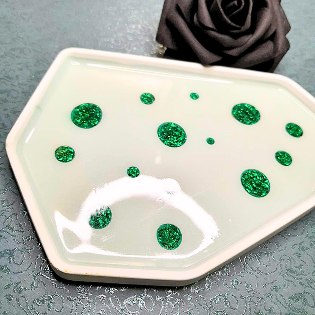 5. Le petit plus : L'utilisation de l'éco-résine pour une base mate contrastée par des incrustations de bulles en résine UV. La finition protectrice assure la durabilité de l'objet tout en mettant en valeur les feuilles d'or pour un détail esthétique discret.