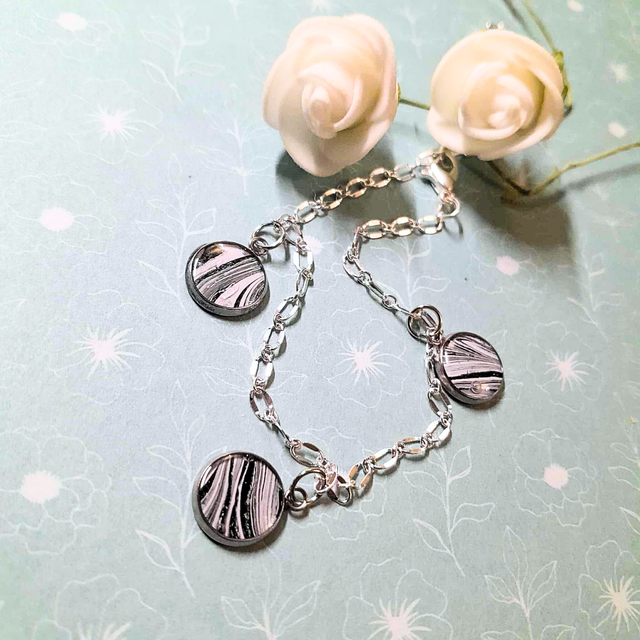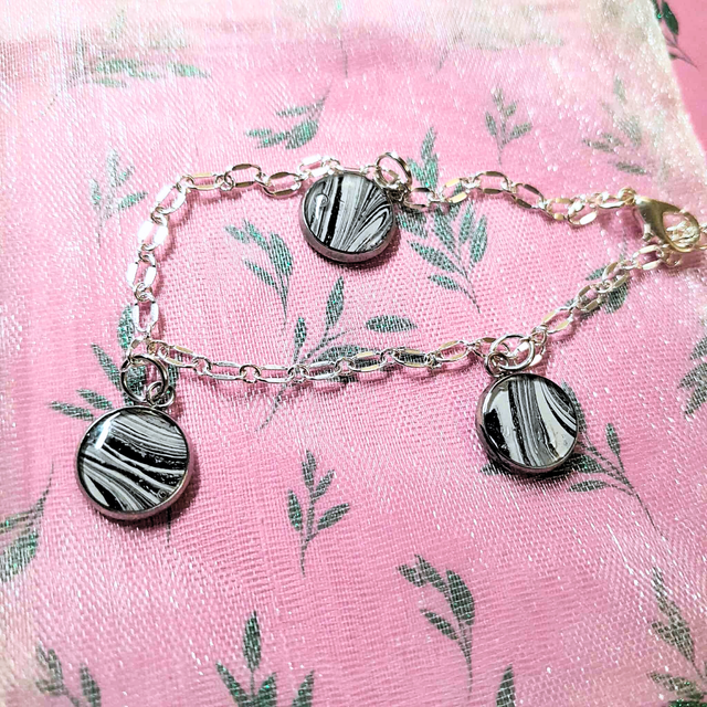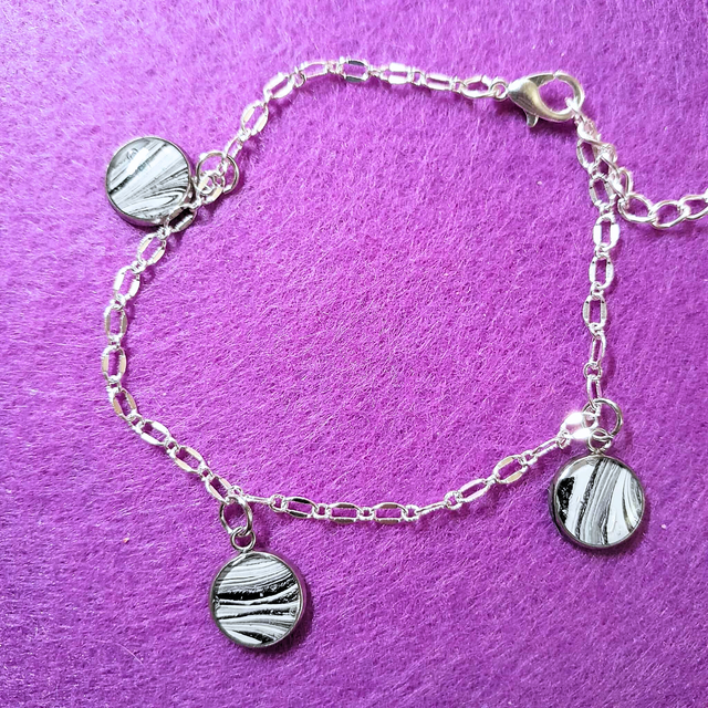 2. Matériaux : Trois cabochons en verre (10 mm), résine UV et chaîne en métal argenté.